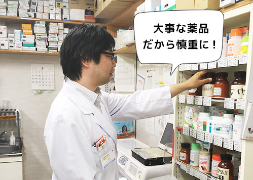 粉薬や錠剤のピッキングなど、処方せんに基づいて調剤を行います。ミスの無いよう、細心の注意を払います。