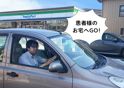 今日は患者様のお宅へ訪問があります。お薬をお宅までお持ちしてお薬の説明や管理のお手伝いをします。